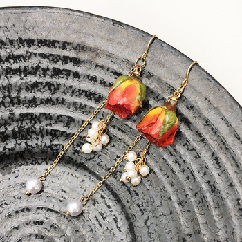 Boucles d'oreilles fleurs séchées faites à la main goutte à goutte alliage créatif boucles d'oreilles perle fleur rose séchée bricolage artisanat pour femmes bijoux